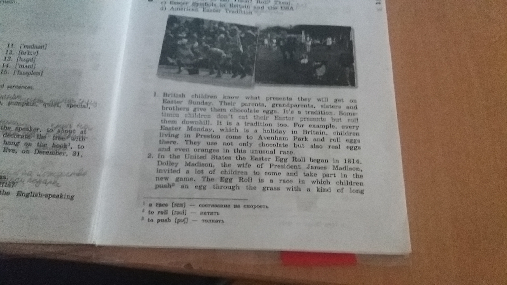 Британские дети знают,какой подарок они получат на Пасху.Их родители:бабушки,дедушки,сестры,братья дарят им шоколадные яйца.Это традиция.Иногда дети не едят свои Пасхальные подарки,но катят их с горы.Это тоже традиция.Например,каждый понедельник Пасхи,который является выходным в Британии,дети живущие в Престоне,приходят в Авенхам парк и скатывают свои яйца здесь.Это могут быть не только шоколадные яйца,но и настоящие, и даже апельсины могут учавствовать в этой необычной гонке.В Соединеных Штатах Пасхальная гонка яиц началась в 1814.Долли Медисон,жена президента Джеймса Медисона,пригласила много детей,чтобы они пришли и приняли участие в новой игре. Скатывание яиц это гонка в которой дети толкают яйца сквозь траву с помощью длинной......