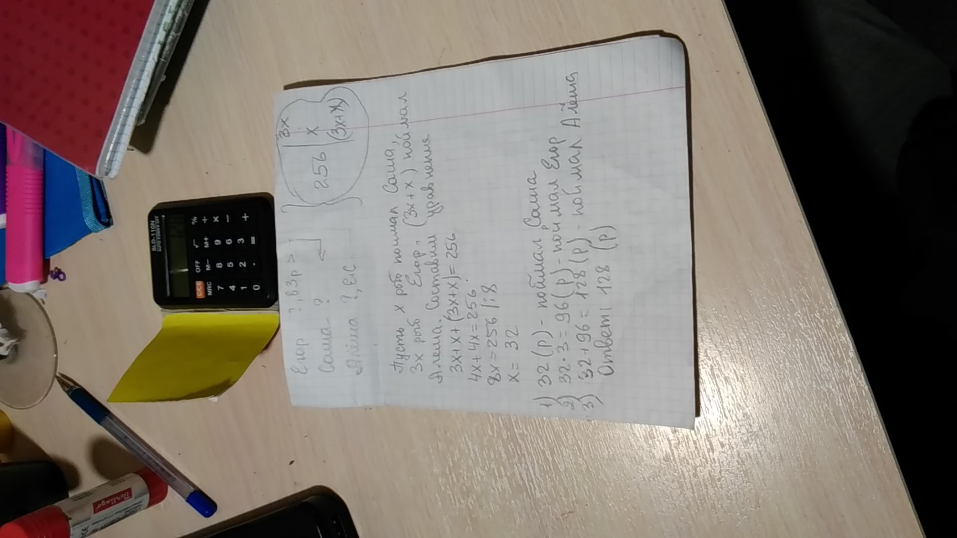 Егор,Саша и Алёша поймали 256 окуней.Егор поймал в 3 раза больше рыб ,чем Саша , а Лёша - столько, сколько Егор и Саша вместе. Сколько окуней поймал лучший рыбак?