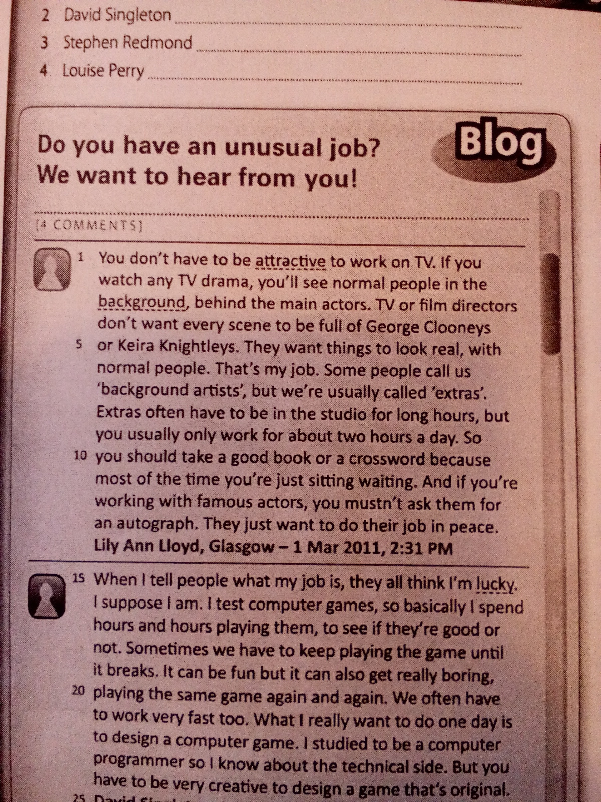 1 Вы не должны быть привлекательными для работы на ТВ .Если вы смотрите любой телевизионной драмы, вы будете видеть нормальные люди на заднем плане, за главными действующими лицами. ТВ или режиссеры не хотят, чтобы каждая сцена будет полна Джорджа Clooneys 5 или Keira Knightleys. Они хотят, чтобы выглядеть реальным, с нормальными людьми. Это моя работа. Некоторые люди называют нас "фоновых художников, но мы, как правило, называют" Extras Extras "часто должны быть в студии в течение долгих часов, но вы, как правило, работают только в течение двух часов в день, так что 10 вы должны взять хорошую книгу или кроссворд, потому что большую часть времени вы просто сидя ждать. А если вы работаете с известными актерами, вы не должны просить у них автограф. Они просто хотят, чтобы сделать свою работу в мире. Лили Энн Ллойд, Глазго 1 марта 2011, 2:31 вечера 15 Когда я говорю людям, что моя работа состоит в том, все они думают, что мне повезло. Я полагаю утра. тестовые компьютерные игры, поэтому в основном проводят часы и часы, играя в них, чтобы увидеть, если они хороши или нет. Иногда мы должны продолжать играть в игру, пока она не сломается. Это может быть интересно, но он также может получить действительно скучно, 20 играет в ту же игру снова и снова. Нам часто приходится работать очень быстро, тоже, что я действительно хочу сделать один день, чтобы разработать компьютерную игру. учился, чтобы быть компьютерным программистом так знают о технической стороне. Но вы должны быть очень творческим, чтобы создать игру, которая оригинально.