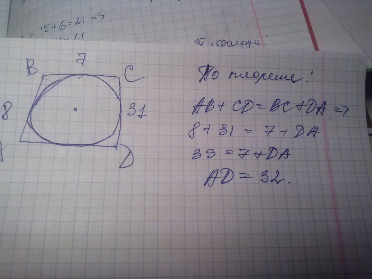 В чет-уг АВСД вписана окружность АВ=8 ВС=7 и СД=31.Найдите четвёртую сторону чет-уг. с чертежом пожалуйста