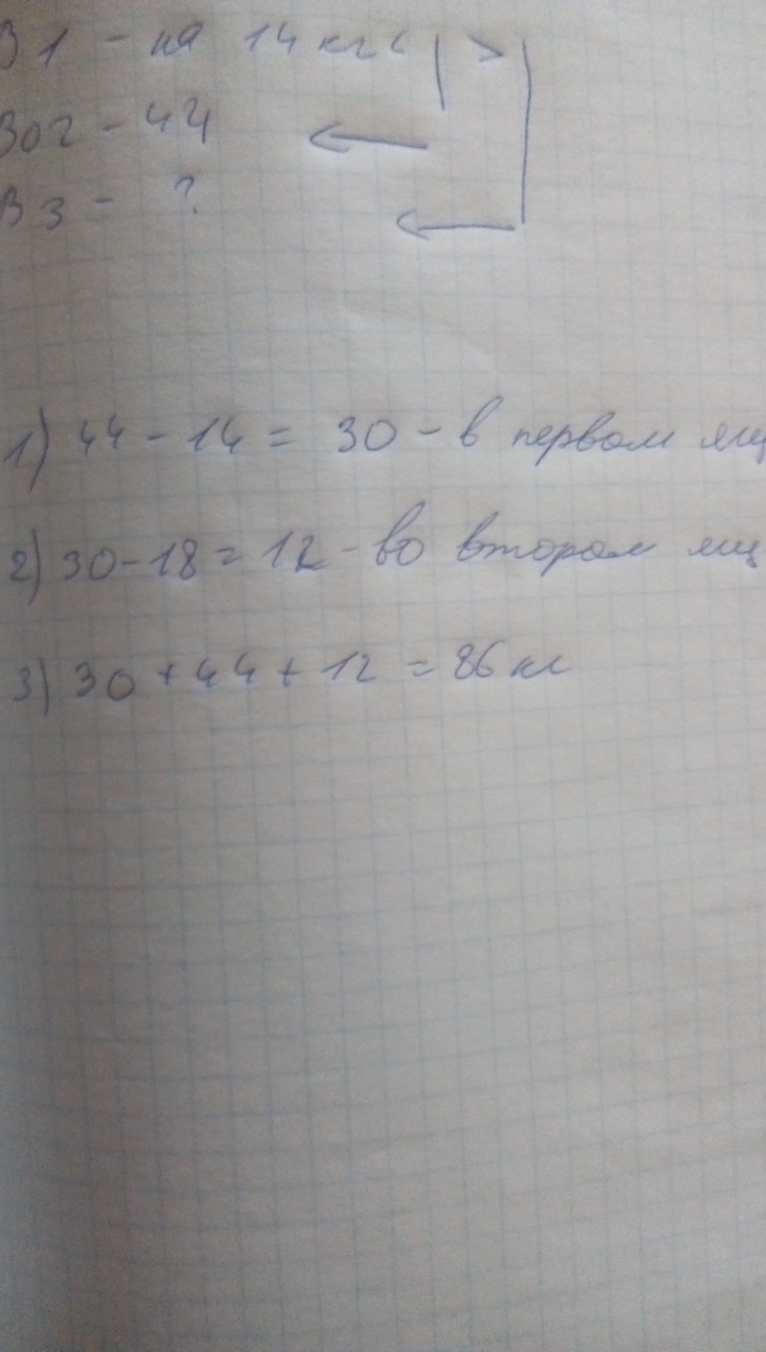 1ый ящик (44-14), 2ой ящик (44), 3ий ящик (44-14+18) ответ: всего 122 кг апельсин