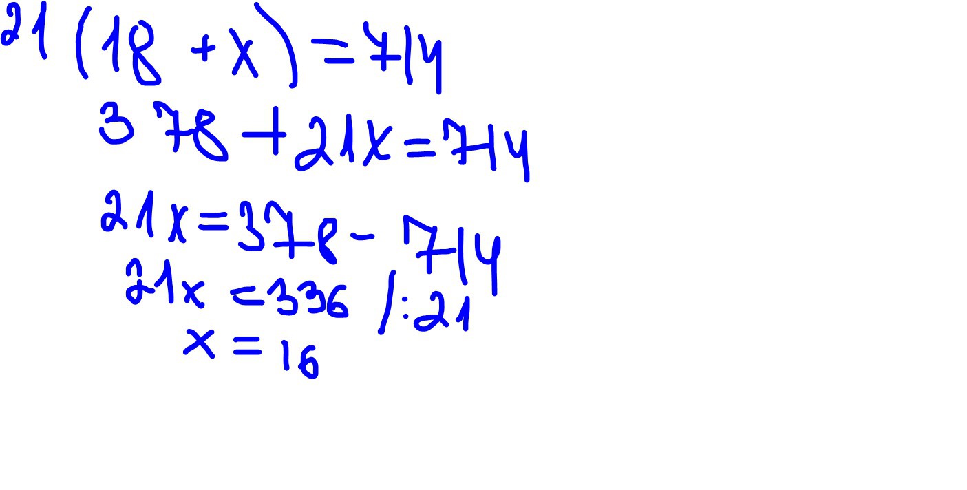 решить уравнение 1)21(18+x)=714 2)16(4x-34)=608;