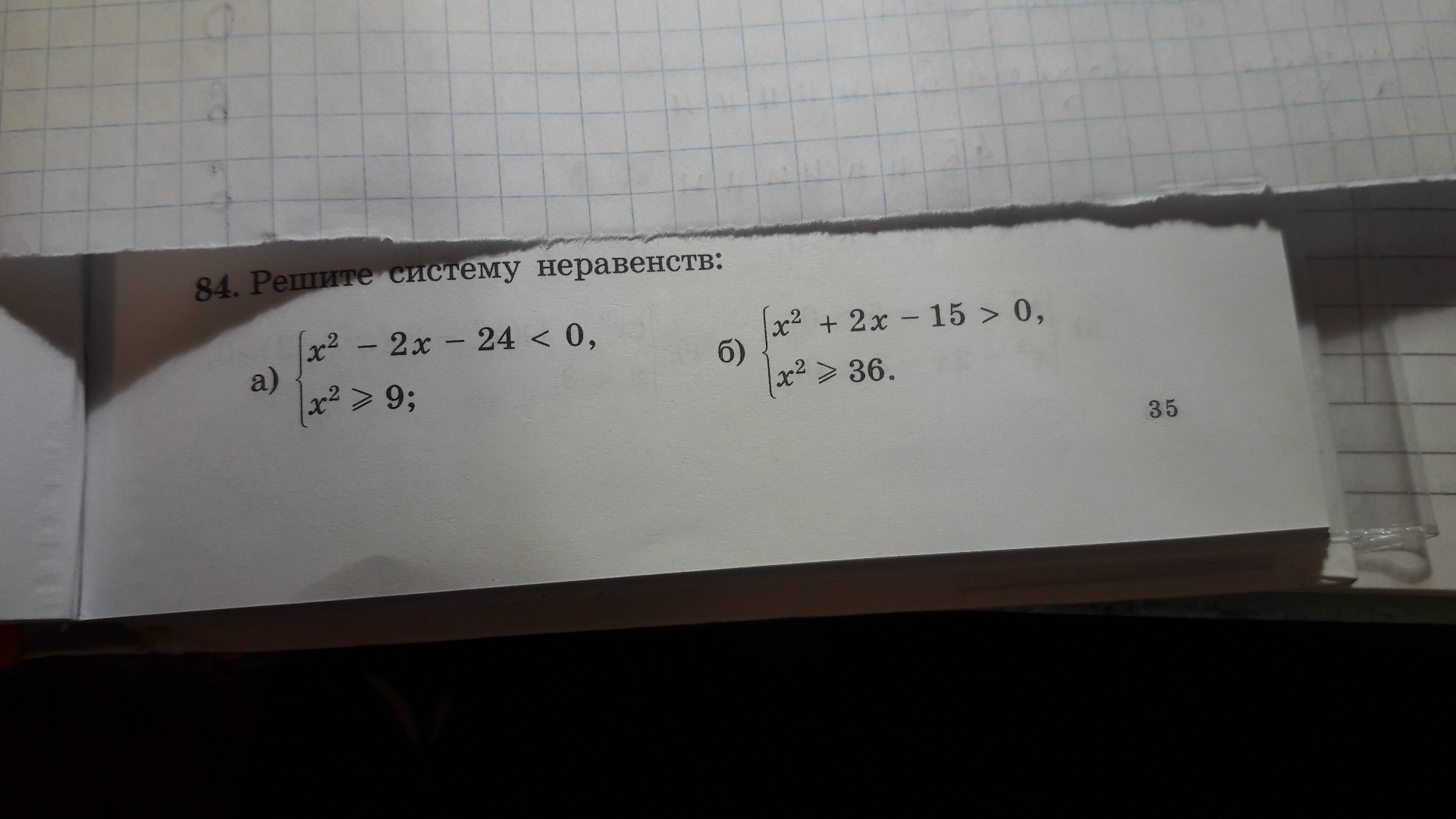 а) из x²≥9 →x∈(-∞;-3]∪[3;∞) x²-2x-24<0 корни по Виету 6 и -4.