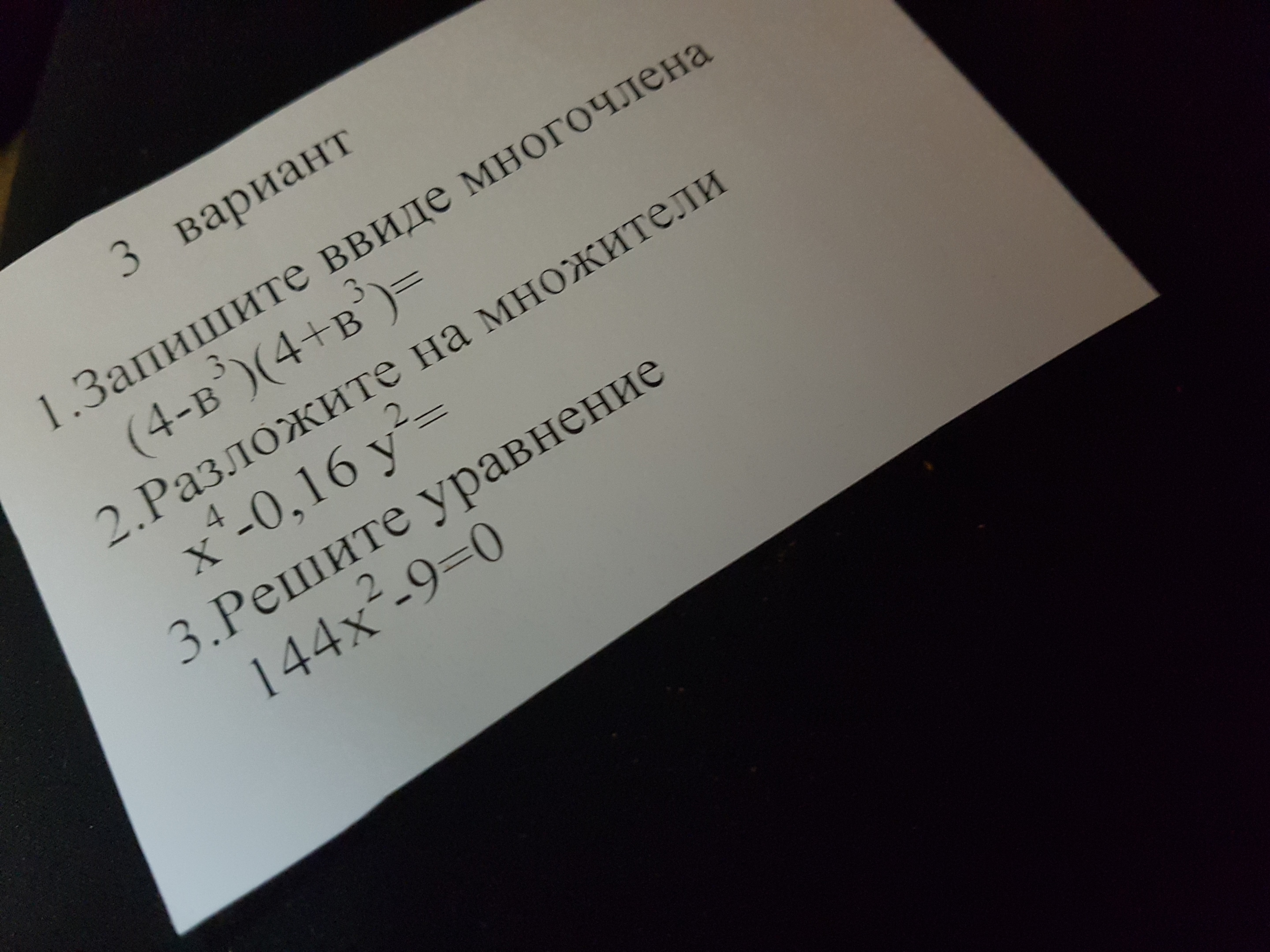 1)(4-в^3)(4+в^3)=4^2-в^9=16-в^92) х^4-0,16у^2=(х^2-0,4у)(х^2+0,4у)3)144х^2-9=0(12х-3)(12х+3)=012х-3=0:(12x+3)12x-3=0(т.к. если любое число делить на ноль,всегда будет ноль)12х=3х=3:12x=0.25