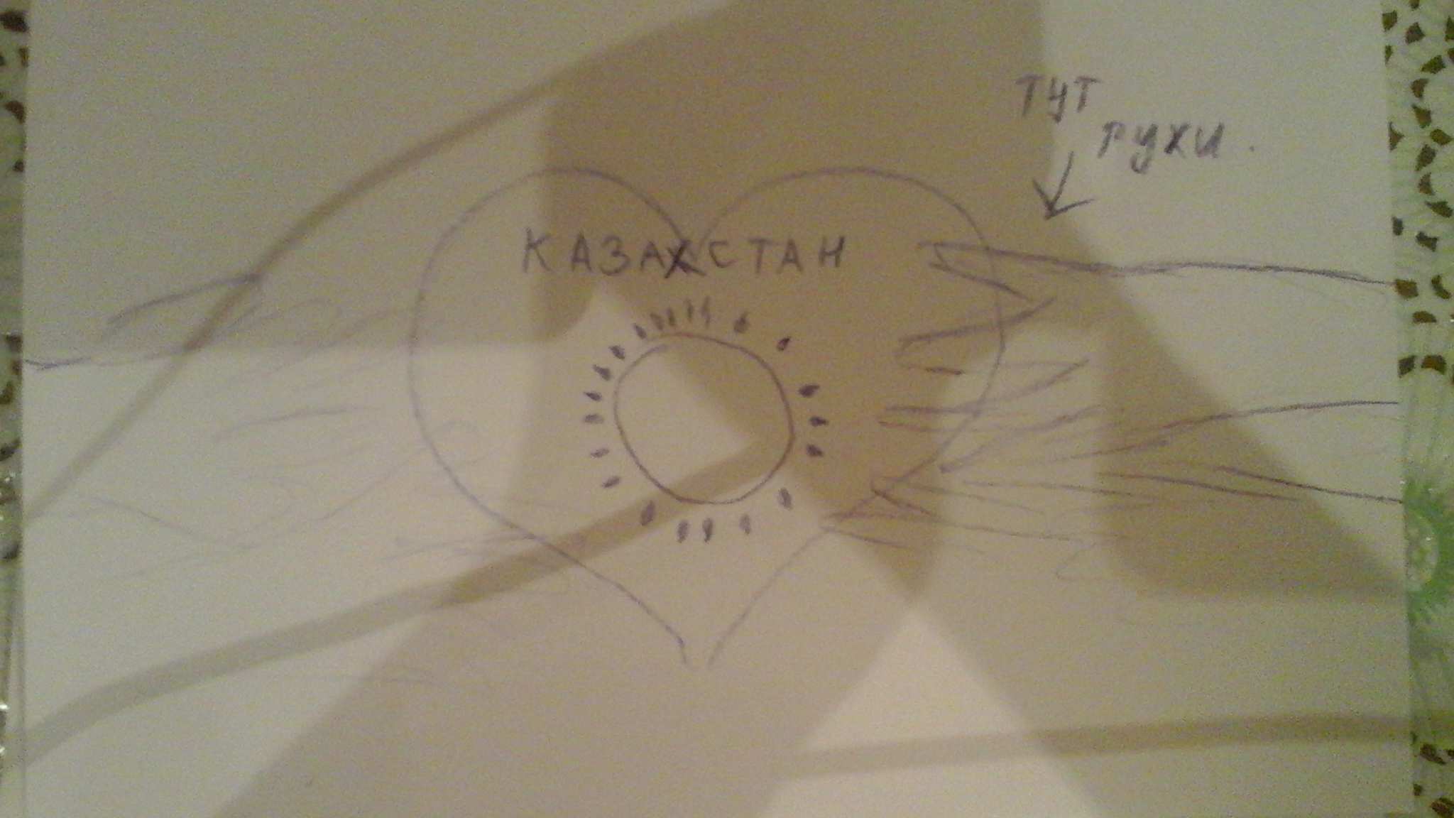 Пример внизу. Не пугайтесь я просто не умею рисовать нормально руки. Тоесть просто берете и рисуете руки потом сердце и раскраске сердце так каким цветом является флаг. А дальше можно написать стихи о Казахстане.