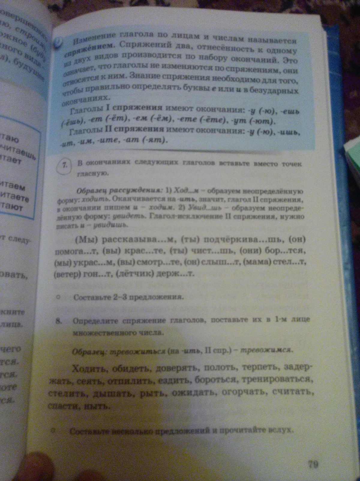Мы рассказываем н.ф рассказывать гл 1 спряжение пишем "е", ты подчеркиваешь н.ф подчеркивать гл 1 спряж пишем "е", он помогает н.ф помогать гл 1 спряж пишем "е", вы красите н.ф красить гл 2 спряж пишем "и", ты чистишь н.ф чистить гл 2 спряж пишем "и",они борются н.ф бороться 1 спряж пишем "ю",мы украсим н.ф украсить 2 спряж пишем "и",вы смотрите н.ф смотреть гл исключение 2 спряж пишем "и",он слышит н.ф слышать гл исключение пишем "и",мама стелет н.ф стелить гл исключение 1 спряж пишем "е",ветер гонит н.ф гнать гл исключение 2 спряж пишем "и",летчик держит н.ф держать гл исключение 2 спряж пишем "и"