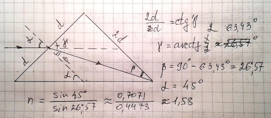 Луч, параллельный основанию призмы, падает на середину ее грани и, преломляясь, попадает в противолежащее этой грани ребро призмы(рисунок). В сечении призмы -- равнобедренный прямоугольный треугольник. Каков показатель преломления материала призмы n? Ответ округлите до десятых.