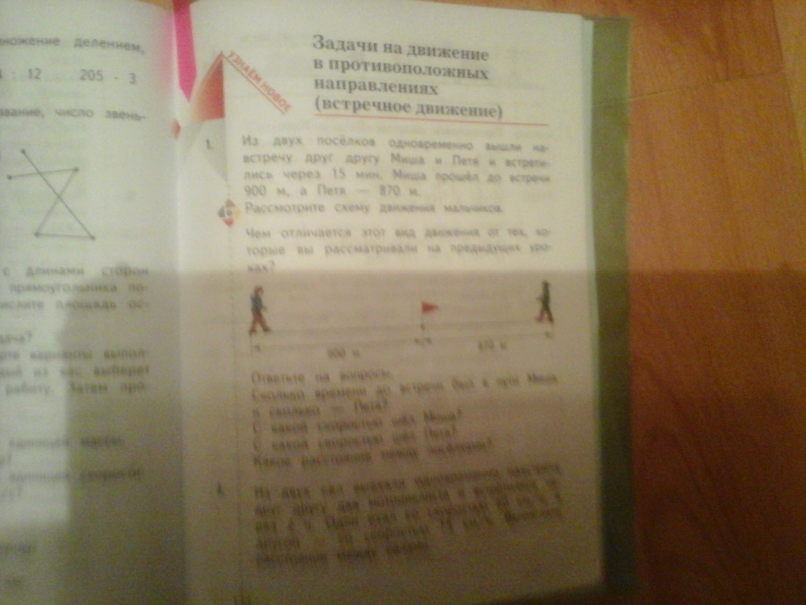 из двух посёлок одновременно вышли навстречу друг другу Миша и Петя и встретились через 15 мин. Миша прошёл до встречи 900 м, а Петя -870 м. Рассмотрите схему движения мальчиков. Чем отличается этот вид движения от тех, которые вы рассматривали на предыдущих уроках ? Помогите плиииз поставлю спасибо и в лучший ответ добавлю только правильно и как в тетради