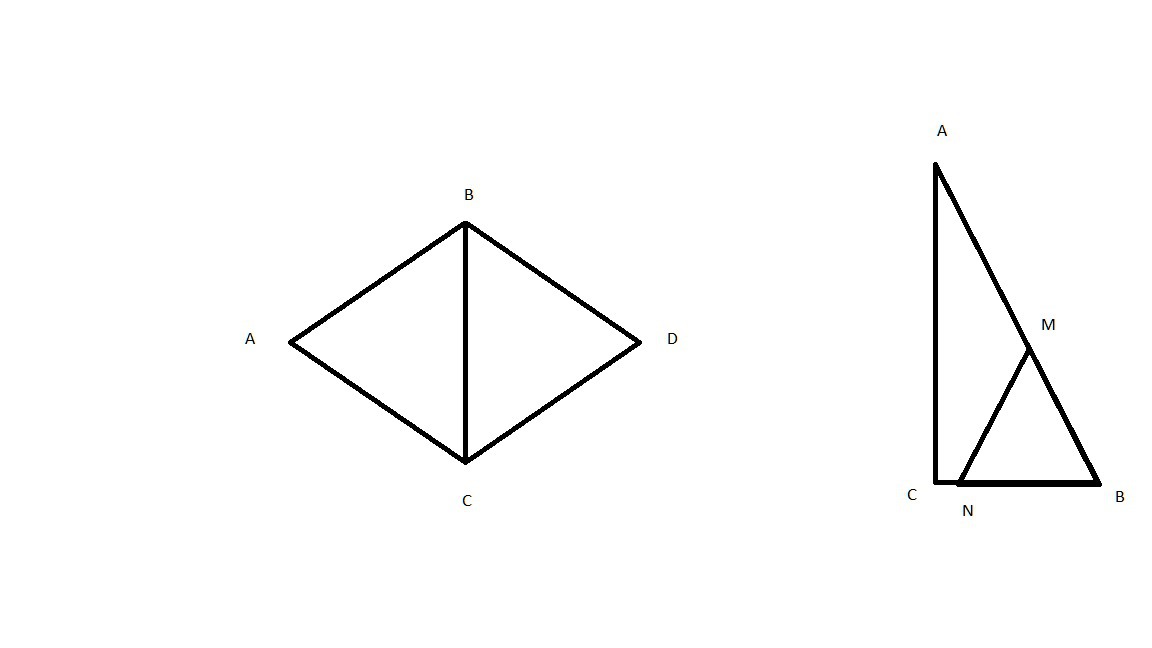 А чего их искать то? Вот тебе два примера. На первом изображены два треугольника ABC и BCD. Сторона BC у них является общей. На втором примере треугольники ABC и BMN. В этом случае треугольники имеют общий угол - B