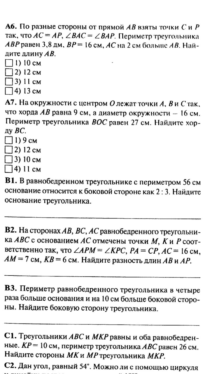 А7. АО=ОВ=ОС=R, значит ΔАВО и ΔОВС - равнобедренные по определению, тогда в ΔАВО: 2АО=Р-АВ; АО=8(см), аналогично в ΔОВС: СВ=Р-2ОС=11(см) Ответ 4)