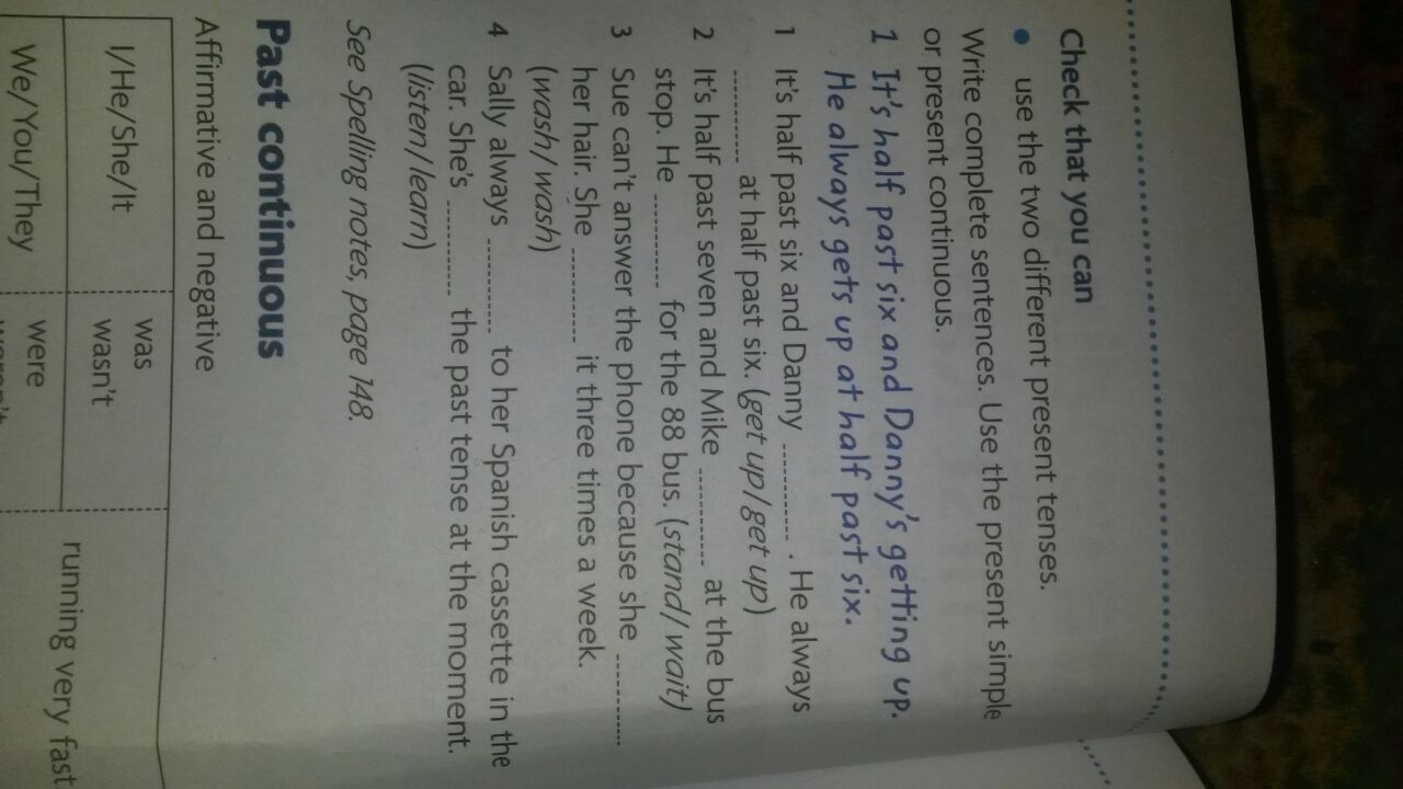 3. Sue can't answer the phone because she is washing her hair. She washes it three times a week.