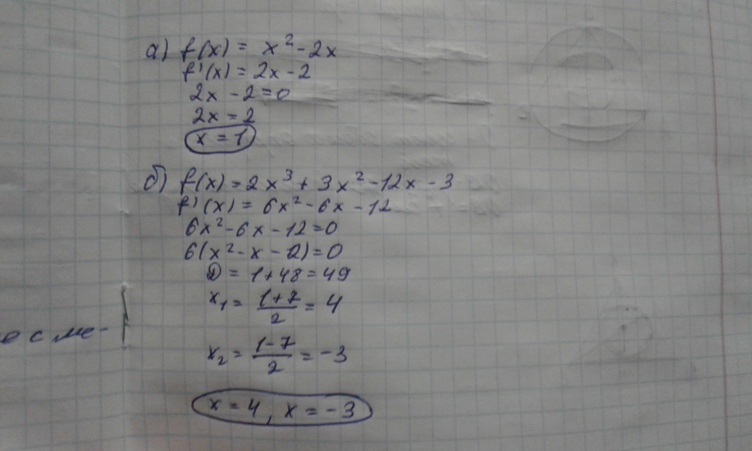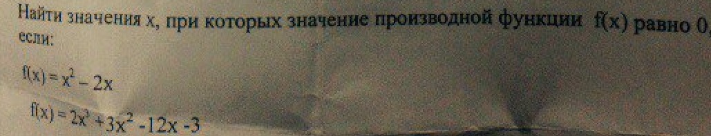 Найдите значение х, при котором значение производной функции f(x) равно 0, если 1) f(x)=x^2-2x 2) f(x)=2x^3+3x^2-12x-3