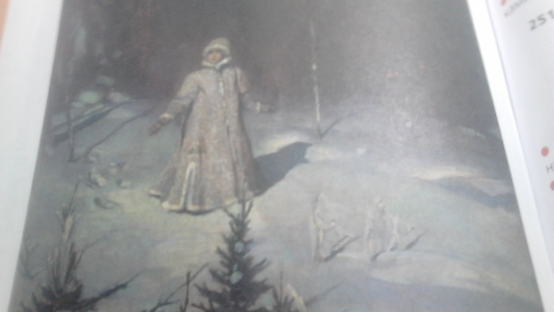 На картине Васнецова Снегурочка изображена Снегурочка,Она одета в белоснежное пальто с красивыми узорами, и в варежках, Снегурочка стоит на поляне у окраины леса,