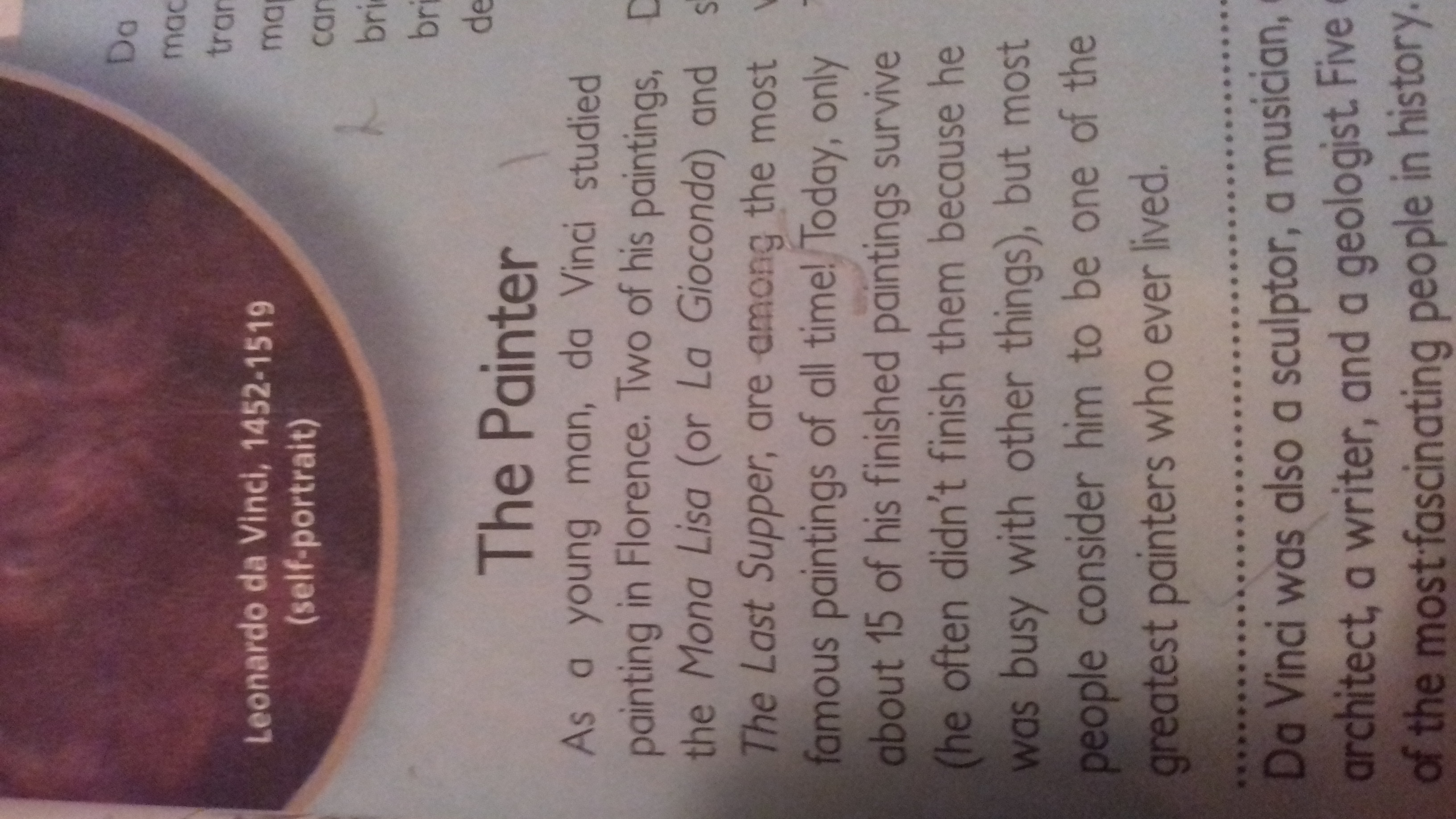 Эх э янг мэн,да Винчи стадит пэинтинг и Флорэнс.Ту оф хиз пэинтинг,зэ Мона Лиза(ор ла Джаконда) энд зэ ласт саппэр,ар эмонг зэ мост фэймоус пэинтингс оф олл тайм.Тудэй онли эбаут 15 оф хиз финишд пэинтингс сёвайв (хи оуфэн диднт финиш зем бикоз хи