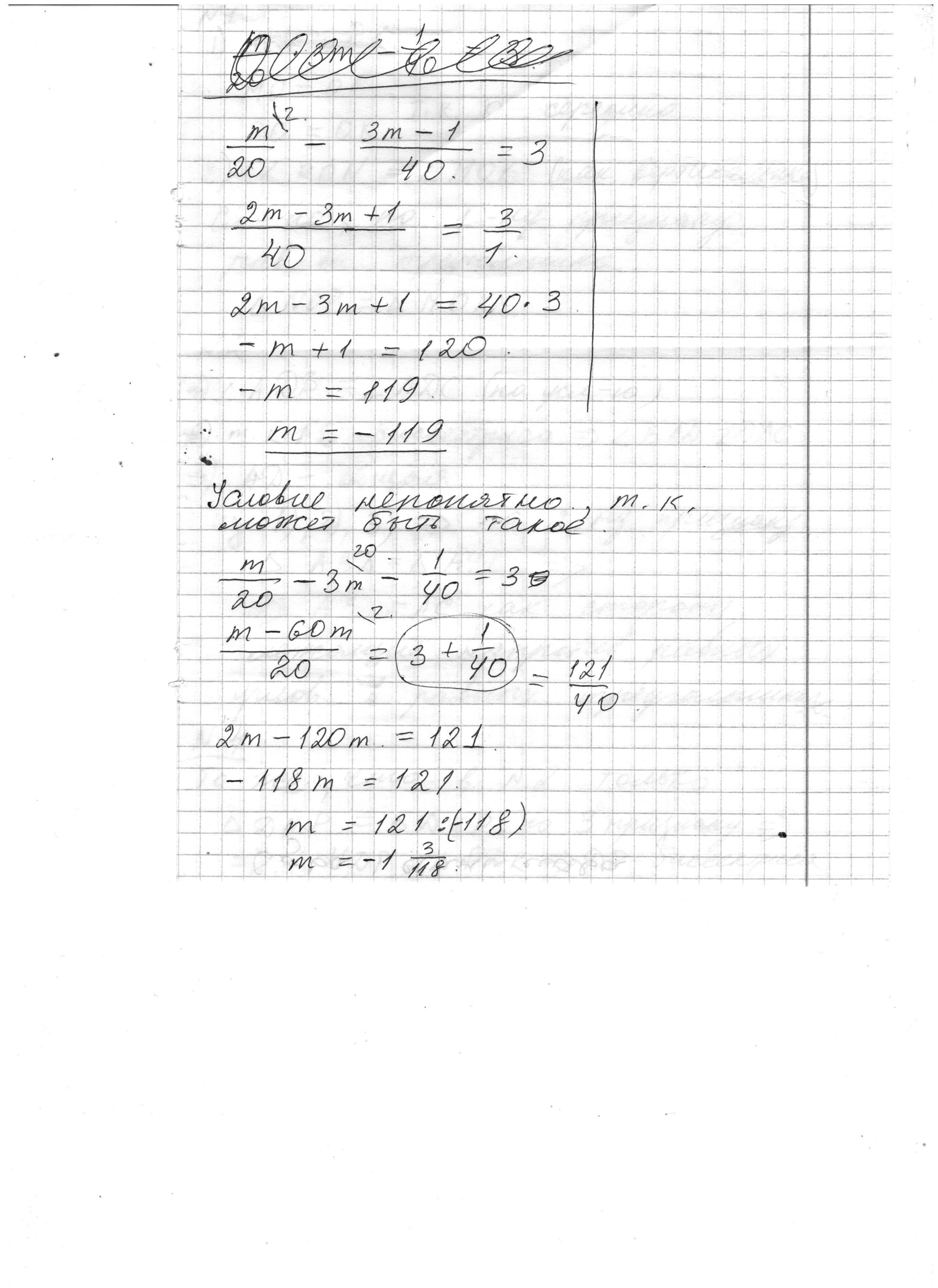 Найди значение переменной m, при котором разность дробей m/20(дробь) 3m-1/40(дробь) равно 3. ПОМОГИТЕ ПОБЫСТРЕЕ