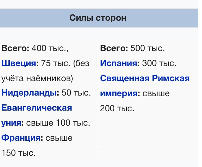 Это первая общеевропейская война между двумя крупными группировками держав за господство в Европе: габсбургской (испанские и австрийские Габсбурги, поддержанные папством и католическими князьями Германии, а также Речью Посполитой) и антигабсбургской коалицией [Франция, Швеция, Дания, Республика Соединённых провинций (Голландия), а также Англия и Россия], опиравшейся на протестантских князей Германии и антигабсбургское движение в Чехии, Трансильвании и Италии.