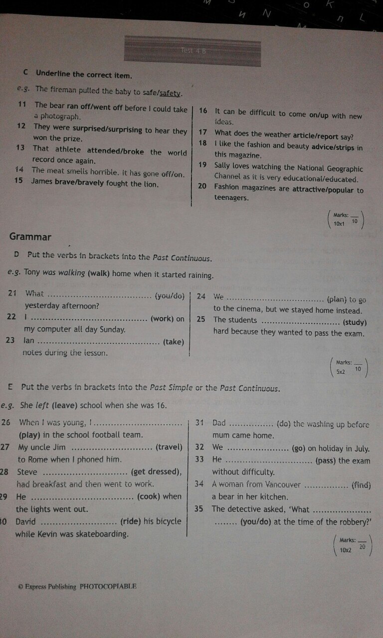 played 27 was traveling 28 got dressed 29 was cooking 30 was riding 31 did 32 went 33 passed 34 found 35 were you doing