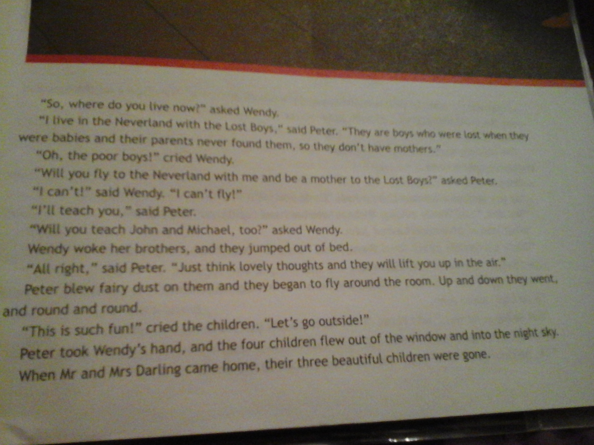 Питер сжал руку Венди и четыре ребёнка вылетели из окна в ночное небо. Когда мистер и миссис Дарлинг вернулись домой, три их прекрасных ребёнка исчезли.
