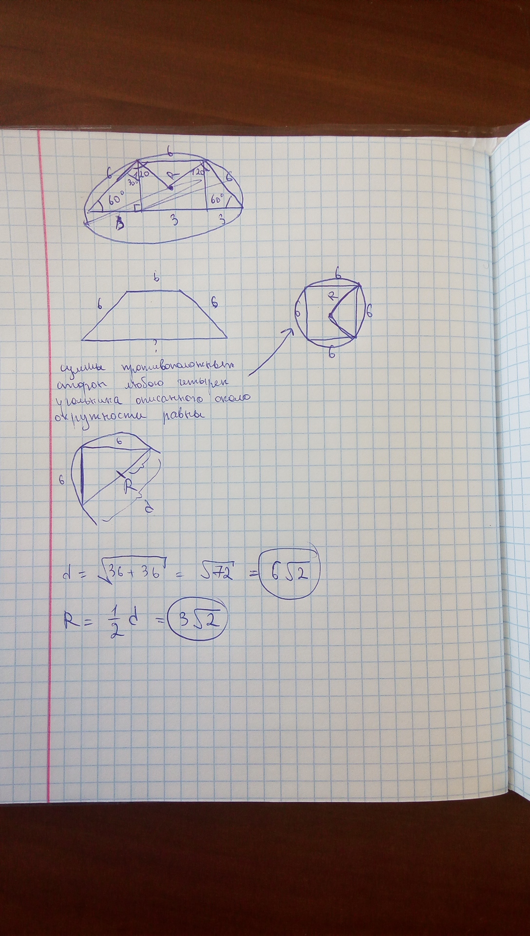 Боковые стороны и меньшее основание равнобокой трапеции равны 6 см, а один из её углов равен 60 градусам. Найдите радиус окружности описанной около данной трапеции.