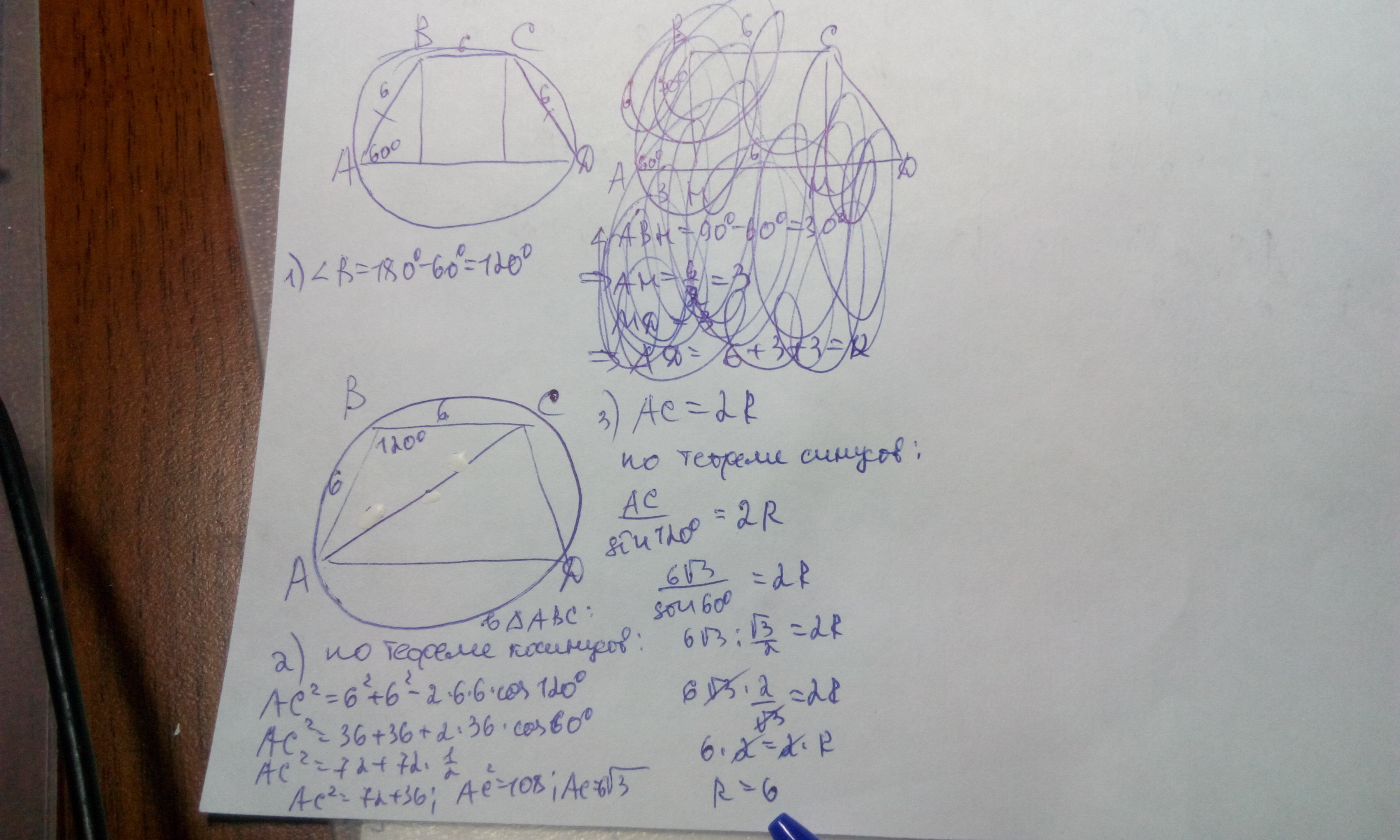 Боковые стороны и меньшее основание равнобокой трапеции равно 6 см, а один из её углов 60 градусам. Найдите радиус окружности описанной около данной трапеции.