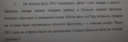 Последний покинувший остров точно - рыцарь, ведь он сказал правду и на острове осталось поровну и рыцарей лжецов, т.е. не осталось ни тех ни других. Если последний покинувший остров рыцарь, как мы рассмотрели выше, то и первый должен быть рыцарем, чтобы были верны все условия. Таким образом именно рыцарей должно быть на одного больше. т.е. правильное решение задачи (2013-1):2=1006 лжецов и соответственно 1007 рыцарей.