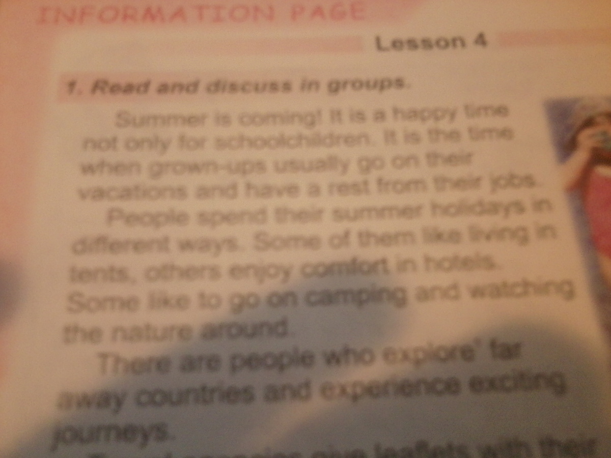 Приближается лето! Это счастливое время не только для школьников. Это время, когда взрослые обычно идут в отпуск и отдыхают от своей работы. Люди проводят летние каникулы разными способами. Некоторые живут в палатках, а некоторые предпочитают наслаждаться комфортным отдыхом в отелях. Некоторые люди любят ходить в походы и любоваться природой. Так же есть люди которые людят исследовать далёкие страны и ездить в захватывающие путешествия.