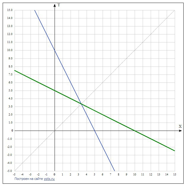 Далее строим на графике прямую проходящие через точки (0;1) (10;8)