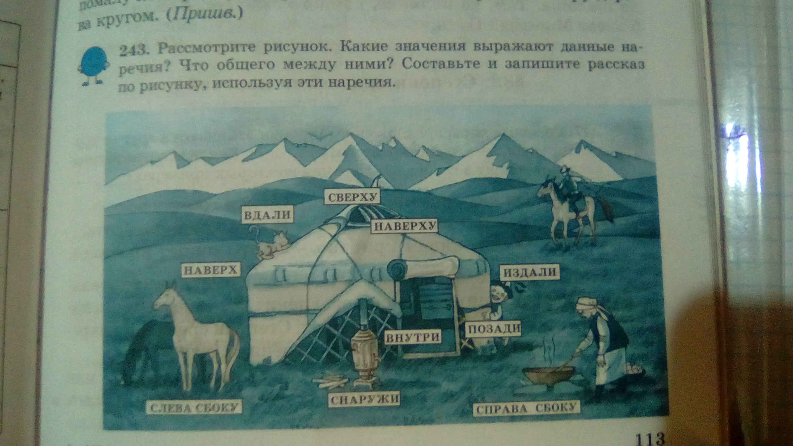 Эти наречия описывают местонахождение тела в пространстве. На картинке мы видим палатку, позади палатки мальчик, сверху кошка, а вдали горы