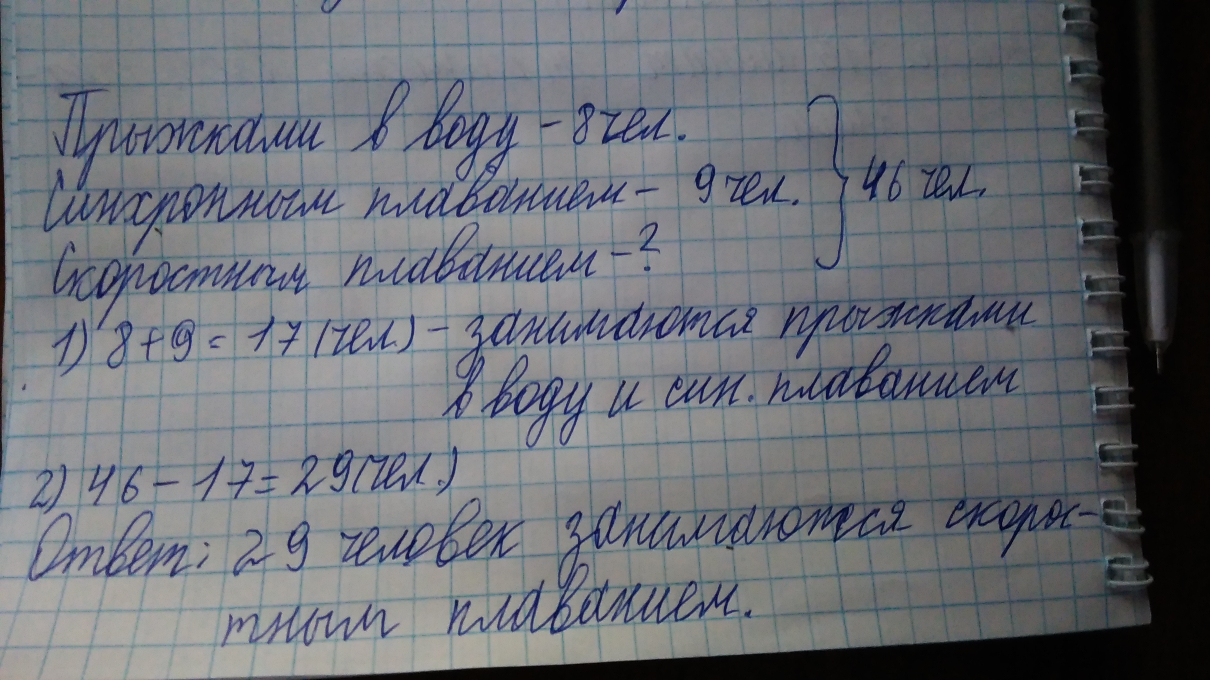 в боссейне занимаются 46 пловцов.из них 8человек занимаются прыжками в воду,9 синхронным плаванием остальные - скоростным плаванием.сколько человек занимается скоростным плаваниием? к. записью