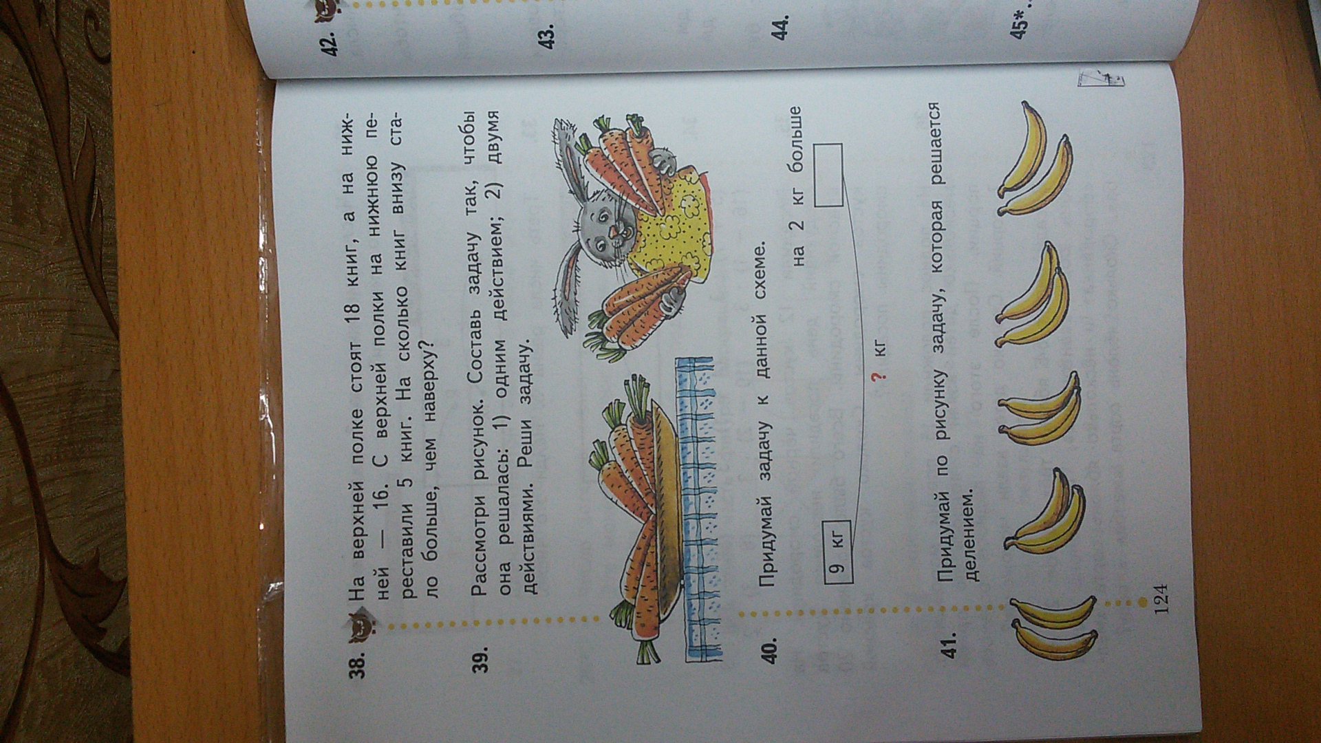 Как я поняла надо самим придумать задачи ,если да,то вот так ---В руке кролика 6 морковок,он съел марковку(ки) и стало 5,сколько он съел? .......Дано-всего 6 морковок ,стало 5,сколько съели? решение 6-5=1 морковку съел )