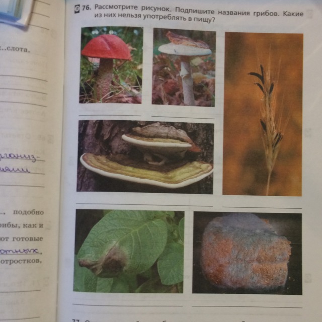 с красной шляпкой-подосиновик,то что рядом-бледная поганка,под ними гриб-трутовик,на листе-фитофтора,рядом-мукор,а последняя-спорынья