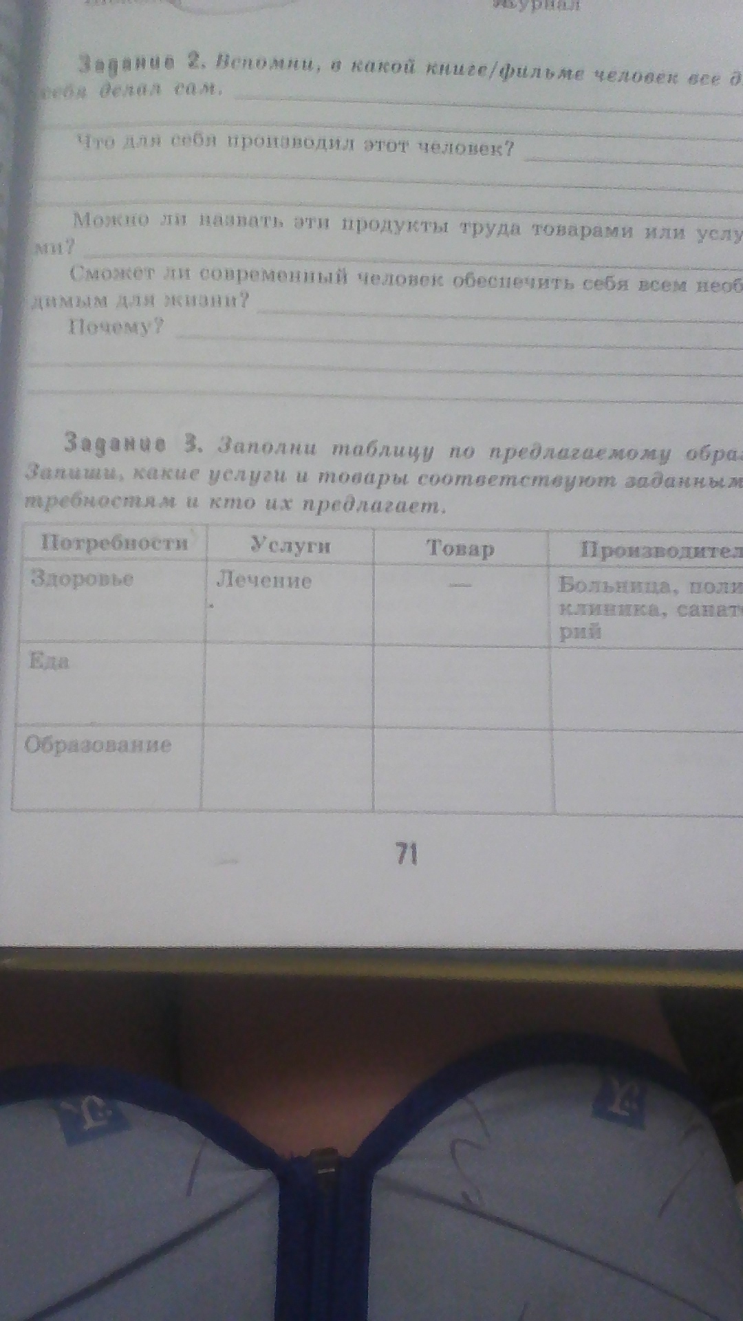 Заполни таблицу по предлагаемуему образцу. Запиши, какие услуги и товары соответствуют заданным потребностям и кто их предлагает