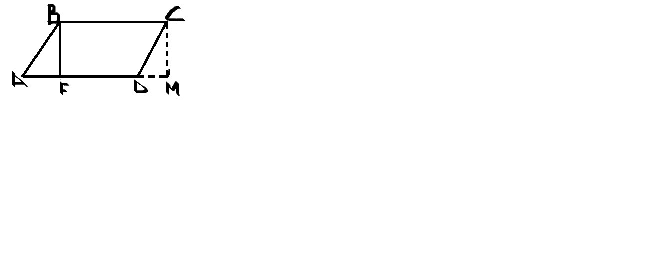 (так как AB=DC и проекция AF=DM). Поэтому площади этих треугольников равны. Площадь паралеллограмма ABCD равна сумме двух фигур: треугольника ABF (равного треугольникуDCM) и трапеции FBCD. Значит, если от площади ABCD вычесть площадь треугольника ABF, получим площадь трапеции FBCD. Тогда площадь параллелограмма ABCD равна площади прямоугольника FBCM. А стороны этого прямоугольника равны BC=AD=а и BF=h.