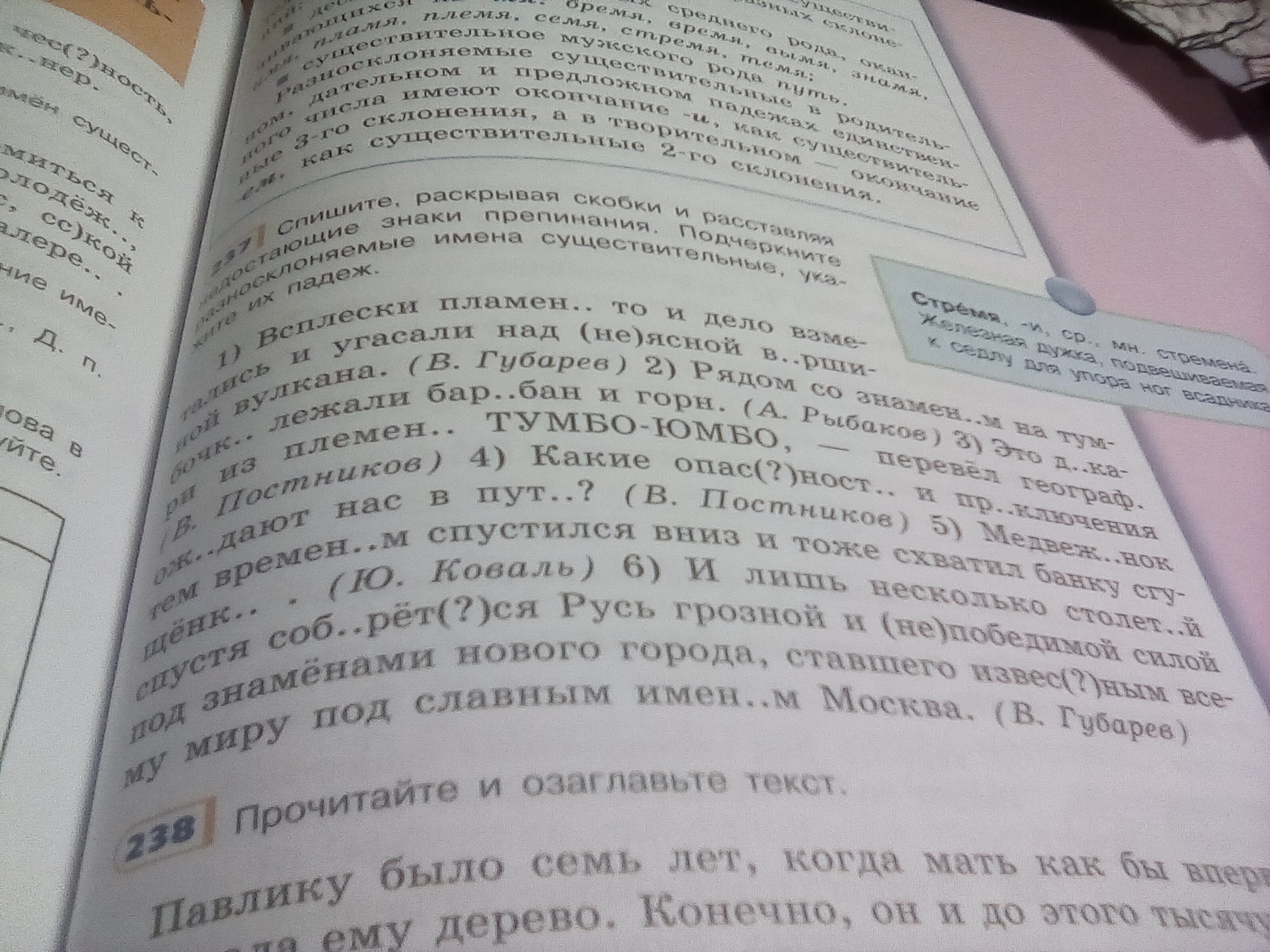 1) Всплески пламени (разноскл.) то и дело взметались и угасали над неясной вершиной вулкана. 2) Рядом со знаменем (разноскл.) на тумбочке лежали барабан и горн. 3) Это дикари из племени (разноскл.) ТУМБО-ЮМБО, - перевёл географ. 4) Какие опасности и приключения ожидают нас в пути? 5) Медвежонок тем временем (разноскл.) спустился вниз и тоже схватил банку сгущёнки. 6) И лишь несколько столетий спустя соберётся Русь грозной и непобедимой силой под знамёнами (разноскл.) нового города, ставшего известным всему миру под славным именем (разноскл.) Москва.