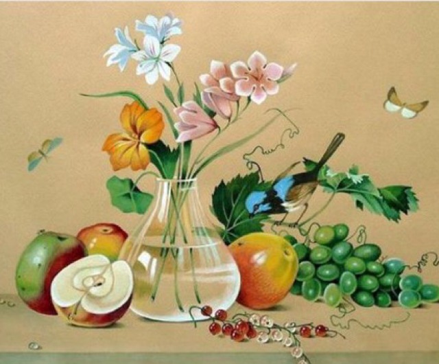 Вот Перед нами картина Федора Толстого «Цветы, фрукты, птица». Это полотноотносится к жанру натюрморт. Жанр натюрморта появился в ХVII веке в Нидерландах. В то время активно развивалась наука, и художники стремились показатьмир живой природы, окружающей человека. В картинах этого жанра изображались цветы, фрукты, овощи и так далее. На полотне Ф. Толстого центральное место занимает ваза с красивыми садовыми цветами. Один цветочек – анютины глазки. Лепестки у него насыщенно желтого цвета с красно – бардовой серединкой. Другие цветочки нежно – кремового и молочно – белого цвета. Стебли и листья цветов ярко – зеленые. Видно, что цветы недавно сорваны, они очень свежие. Вазочка стеклянная с прозрачной водой, в ней хорошо видны стебли цветов. Вокруг вазы нас столе лежат фрукты и ягоды: яблоки, виноград, веточка смородины. Все они сочные, спелые. Художник применяет яркие краски и оттенки для их изображения. Здесь и красный, и оранжевый, и желтый, и зеленый, и оливковый цвета. От них словно исходит вкусный аромат. Так и хочется попробовать ягодку смородины, откусить яблоко или съесть виноградинку. Присутствуют на картине и живые существа. На веточке винограда сидит маленькая разноцветная птичка. Головка и верх спинки у птицы ярко – голубого цвета, животик желтенький, крылышки серовато – зеленоватые. Она склонилась над яблоком и хочет его клюнуть. Также на картине видна беловато – зеленоватая бабочка и серо – зеленый мотылек, летящие над столом. На одном из яблок уютно устроилась муха. Всю композицию художник расположил на деревянном столе, на фоне деревянной стены, поэтому цвет фона тепло – бежевый с оранжевыми прожилками, как на поверхности доски. Эти краски привлекают своей теплотой и домашним уютом. Вызывают теплый отклик в душе зрителя. Федор Толстой, как и все художники, писавшие натюрморты, хочет привлечь внимание зрителей к живой и неживой природе. Показывает ее красоту, очарование, неповторимость. Учит видеть и любить прекрасное во всех проявлениях.