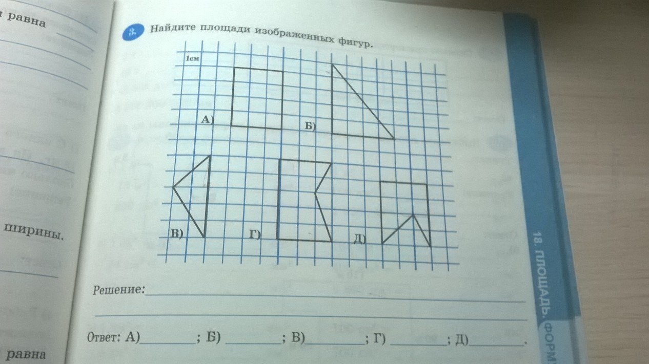 А) 3*4=12см², Б) 5*4=20-10=10см², В)---------- Г) -------------------- Д) 4*3=12-4=8 см²