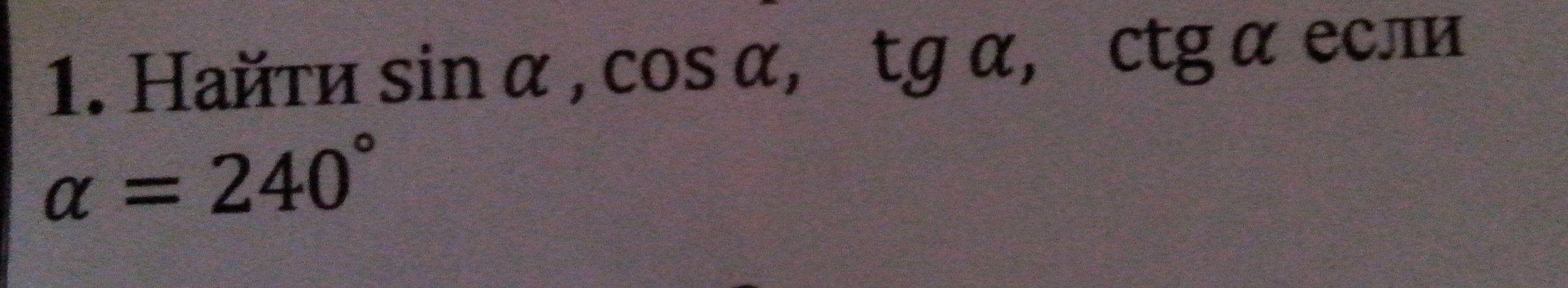 sin240а=2sin120а*cos120а=-frac{sqrt{3}}{2};\cos240а=cos^2alpha-sin^2alpha=-frac{1}{2};\tg240а=frac{sin240а}{cos240а}=frac{-frac{sqrt{3}}{2}}{-frac{1}{2}}=sqrt{3};\ctg240а=frac{cos240а}{sin240а}=frac{-frac{1}{2}}{-frac{sqrt{3}}{2}}=frac{1}{sqrt{3}}=frac{sqrt{3}}{3}.