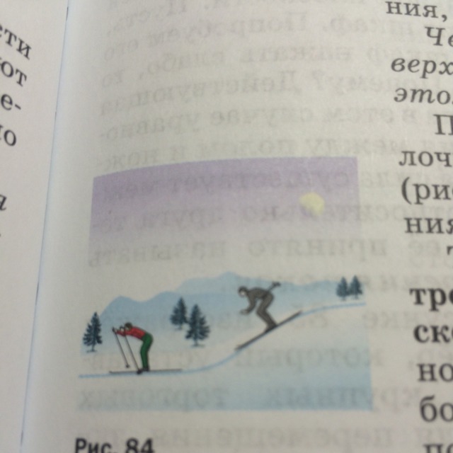 Лыжник спускается с горы и далее скользит по горизонтальной лыжне(рис.84). Изобразите силу трения и точку её приложения.