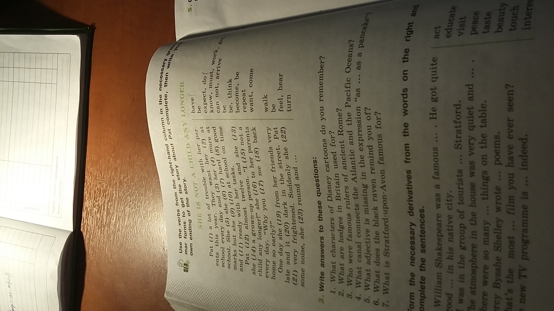 Pat 1.has had a lot of trouble with her parents this year. They want her 2.to be at school every day and 3.expect her 4.to do more at school.She 5.knows she 6.must 7.work hard 8..to get good marks but she 9.cannot 10.arrive at school on time and 11.be ready with her tasks. Pat 12.is almost twelve and she 13.thinks she 14.has become a grown-up person. "I 15.am not a child any longer!"she repeats to her parents every day. "Why do you 17.want me 18.to come back home so early?"One day she 19.was walking from her friends very late and it 20.was dark in the street. Pat 21. felt very frightened. Suddenly she 22.heard some noise she 23.turned round and....
