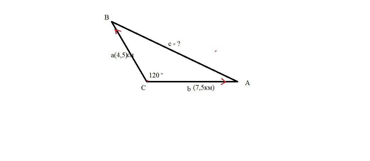 c=√(4,5²+7,5²-2*4,5*7,5*(-0,5)=√110,25=10,5(км) - на таком расстоянии пешеходы будут находиться один от другого через полтора часа.