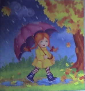 маленькая девочка гуляет в дождливую погоду с зонтиком. Девочке очень нравится гулять в дождь. Она прыгает по лужам.На девочке нету шапочки , на зато у неё есть жёлтый плащ и розовый зонт , колготки в красную и белую полоску и синие ризиновый сапожки с белым цветочком. На данной картине нарисована осень!