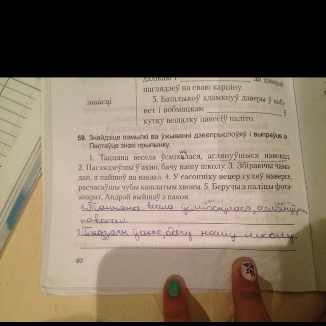1. Таццяна весела ўсміхалася, аглядаючыся навокал. 2. Гледзячы ў акно, бачу нашу школу. 3. Сабраўшы чамадан, я пайшоў на вакзал. 4. У сасонніку вецер гуляў наверсе, расчэсваючы чубы кашлатым хвоям. 5. Узяўшы з паліцы фотаапарат, Андрэй выйшаў з пакоя.