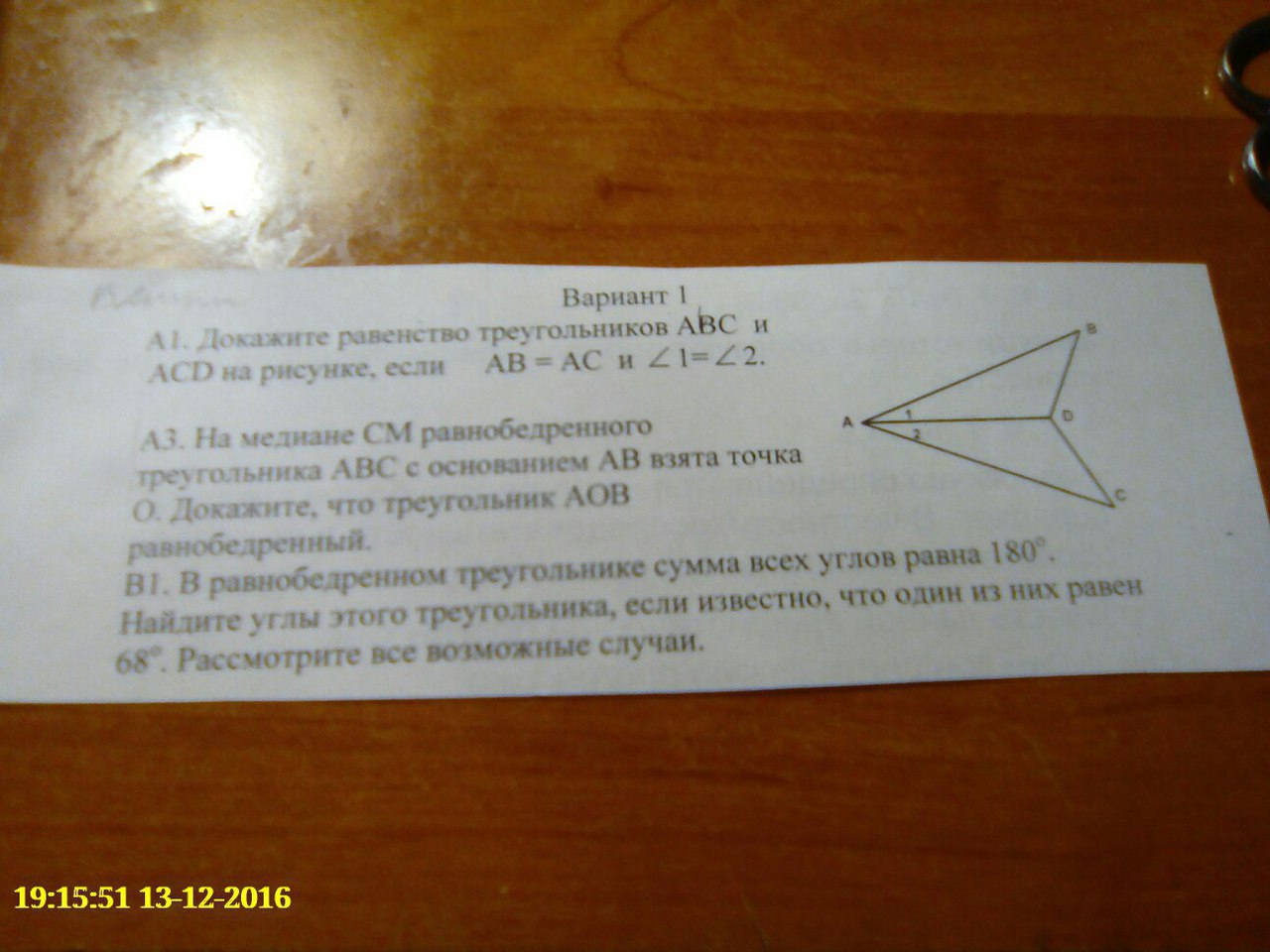 1. АВ=АС, уг1=уг2 и AD-общая, значит ABD=ACD по двум сторонам и углу между ними.