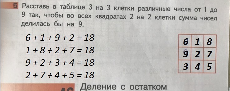 Расставь в таблице 3 на 3 клетки различные числа от 1 до 9 так,что бы во всех квадратах 2 на 2 клетки сумма чисел делилась бы на 9.