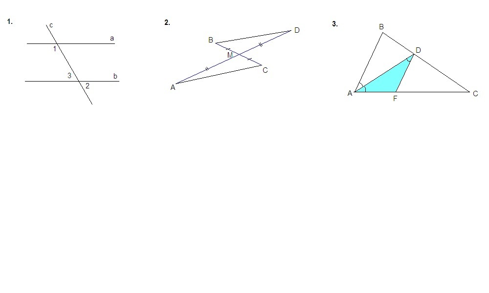 2.Отрезки АD и BC пересекаются в их общей середине точке М. Докажите, что прямые АС и ВD параллельны.