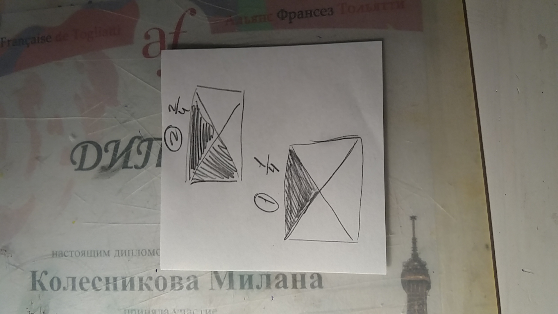 начерти два одинаковых квадрата.Раздели каждый из них на четыре равных треугольника.Раскрась в одном четвёртую часть квадрата,а в другом две четвёртые части квадрата