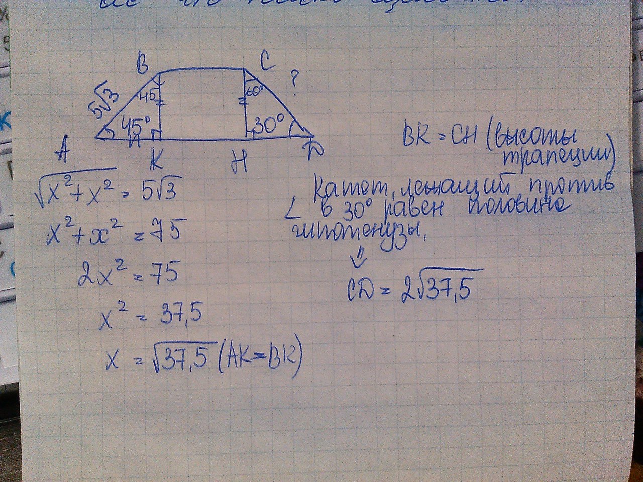25 БАЛЛОВ) углы BAD и CDA при основании AD трапеции ABCD равны 45 градусов и 30 градусов соответственно боковая сторона АВ равна 5√3. Найдите сторону СD