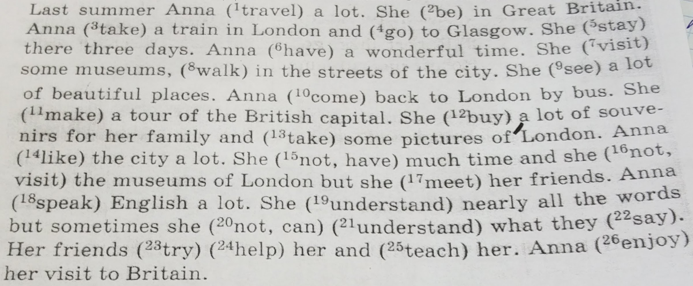 Traveled, was, took, went, stayed, helped, visited, walked, saw, came, made, bought, took, liked, didn't have, didn't visit, met, spoke, understood, didn't can understand, said, tryed, helped, taught, enjoyed