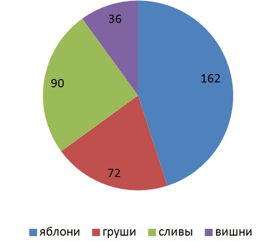 построй круговую диаграмму процентного распределения видов фруктовых деревьев в саду : яблони - 45% , груш - 20%, сливы - 25%, вишни - 10%.