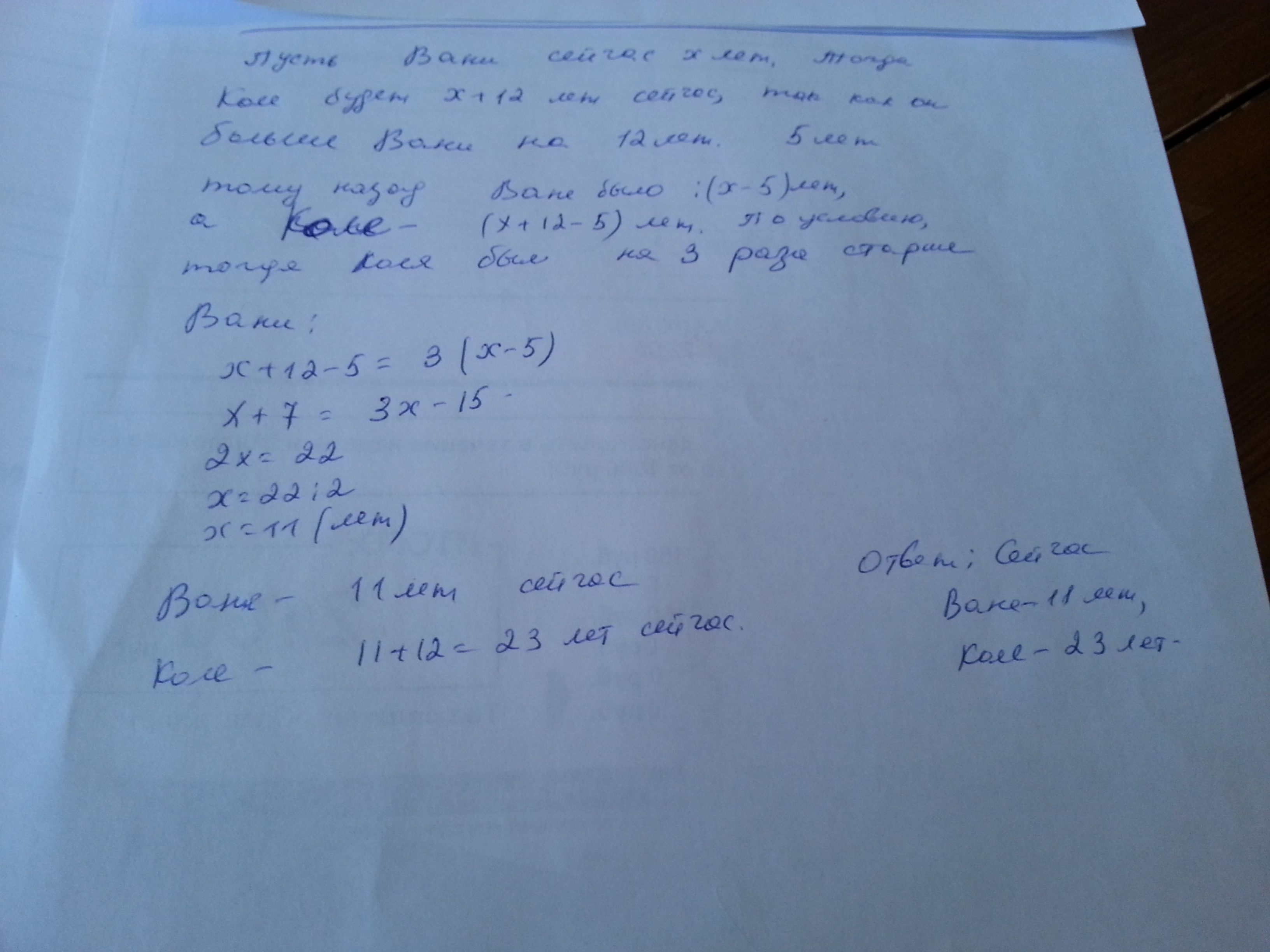 5 лет назад Коля был в 3 раза старше Вани когда Ваня родился Коли было 12 лет Сколько лет каждому из них сейчас?+решение